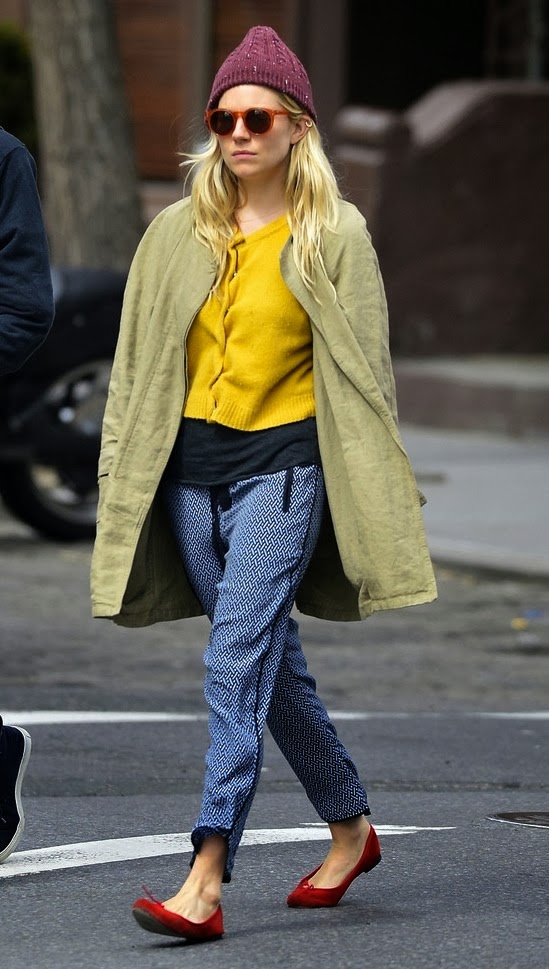 I love Sienna Miller´s street style. She´s elegant, rocker and original with her own bohemian and simple style. I love the way she wears black and white clothes, grey and beige and she always uses some detail with a bright color...